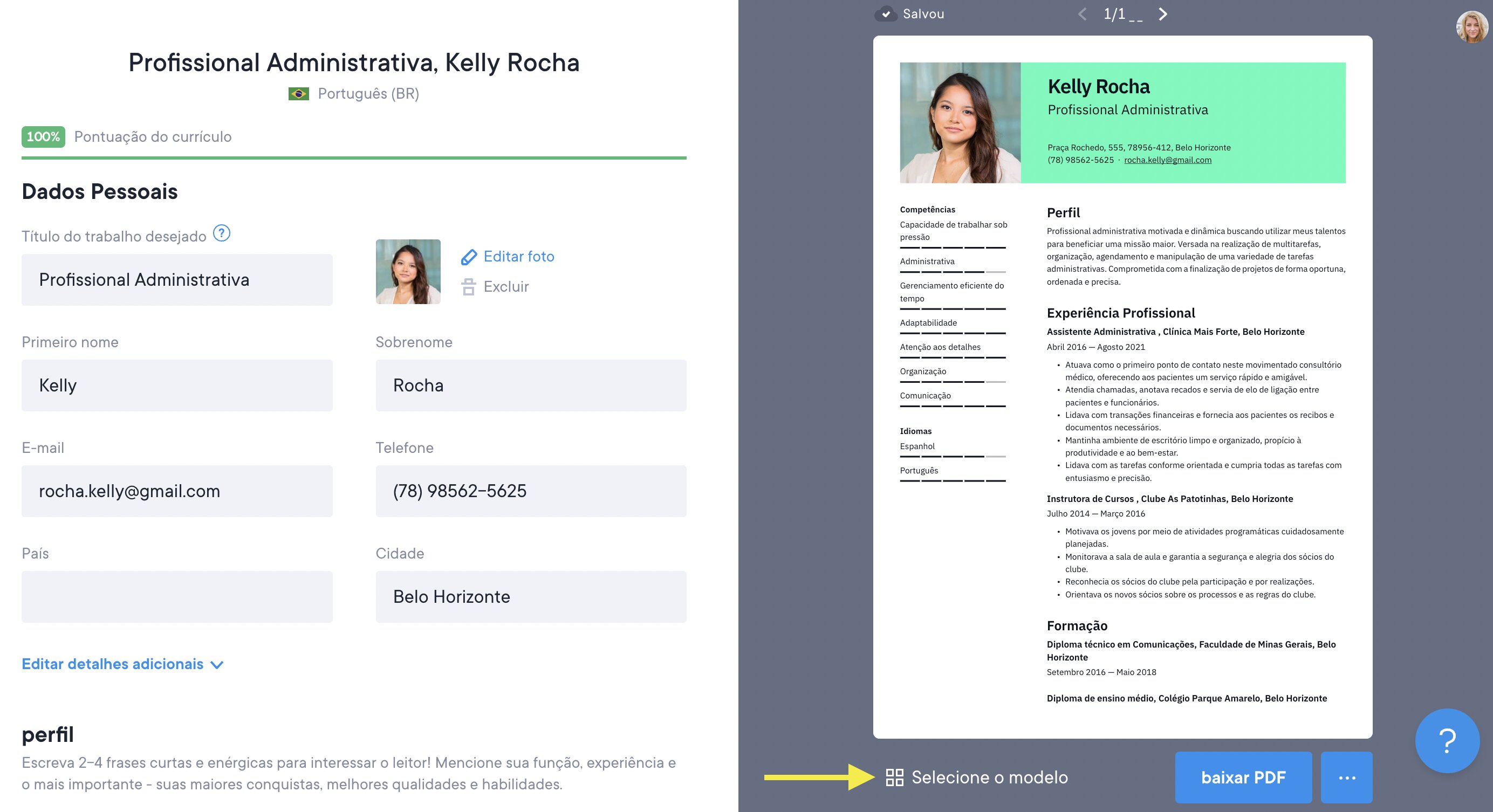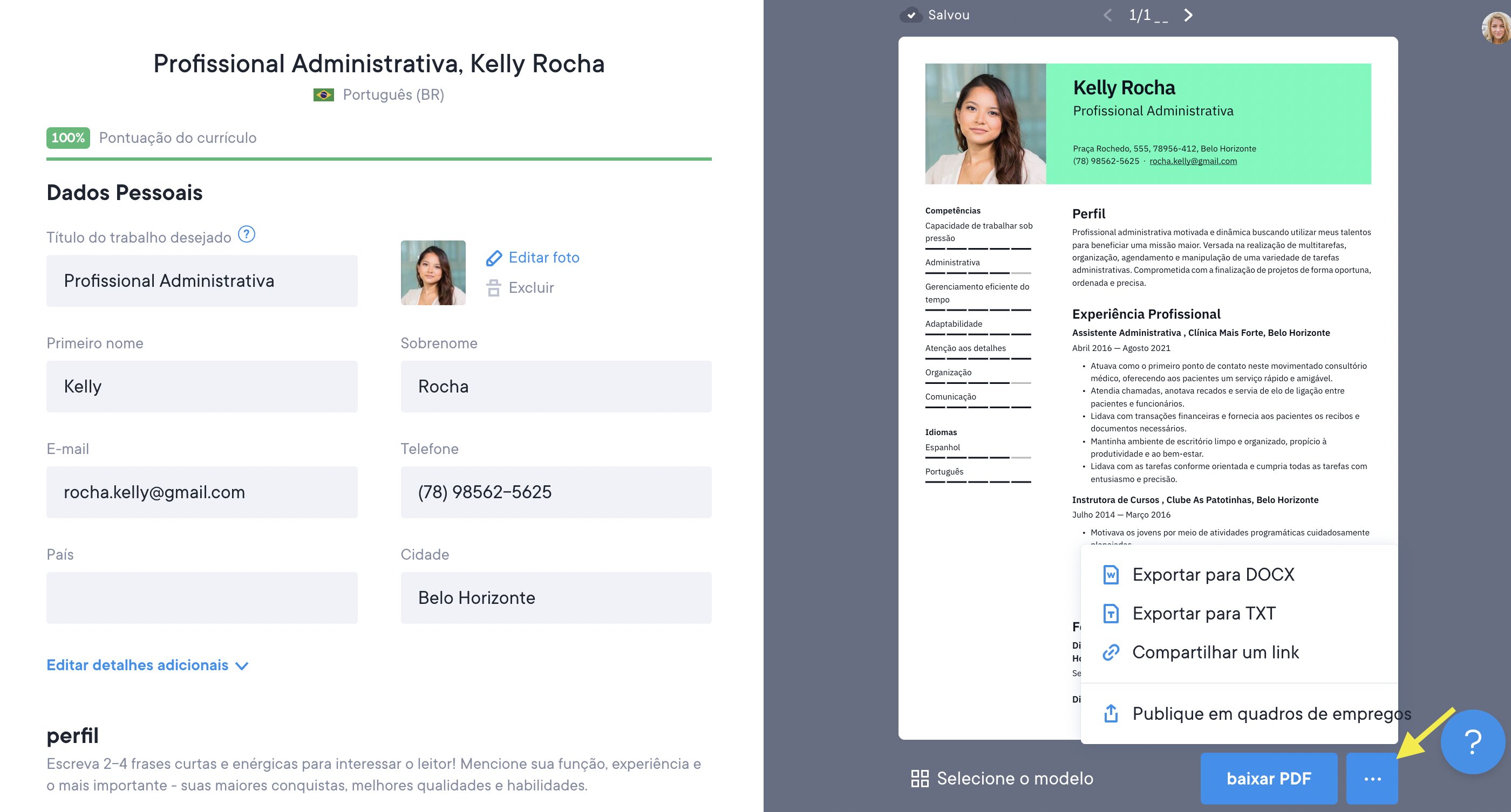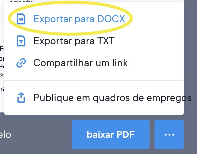 Sempre haverá 3 opções para baixar o currículo: como arquivo TXT (gratuito), PDF ou arquivo DOCX. A aparência dele sempre será a mesma, independentemente da opção de download escolhida, com exceção do arquivo TXT.