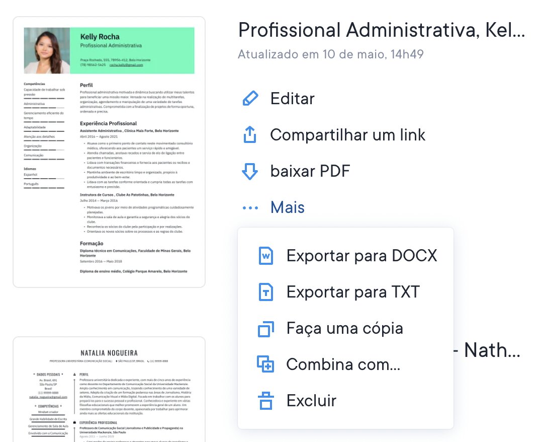 No momento, estamos executando uma versão beta do download de currículos para o formato DOCX e, assim que o testarmos corretamente, a atualização estará disponível para todos os nossos usuários. Trata-se de um recurso Premium que pode ser útil em alguns países em que os empregadores exigem um documento do Word em vez de um PDF. Esse recurso legal está disponível apenas clicando no botão “...” ao lado do botão “Download” em nosso gerador (veja abaixo). Exportar para DOCX Você também pode baixar seu currículo como um arquivo DOCX. Os arquivos DOCX (Word) podem ser salvos em nossos modelos mais populares, Estocolmo e Sydney. Confira a prévia acima para ver como seu documento ficará após a exportação. Os arquivos DOCX permitem que você edite estilos, tamanhos e cores no seu dispositivo.