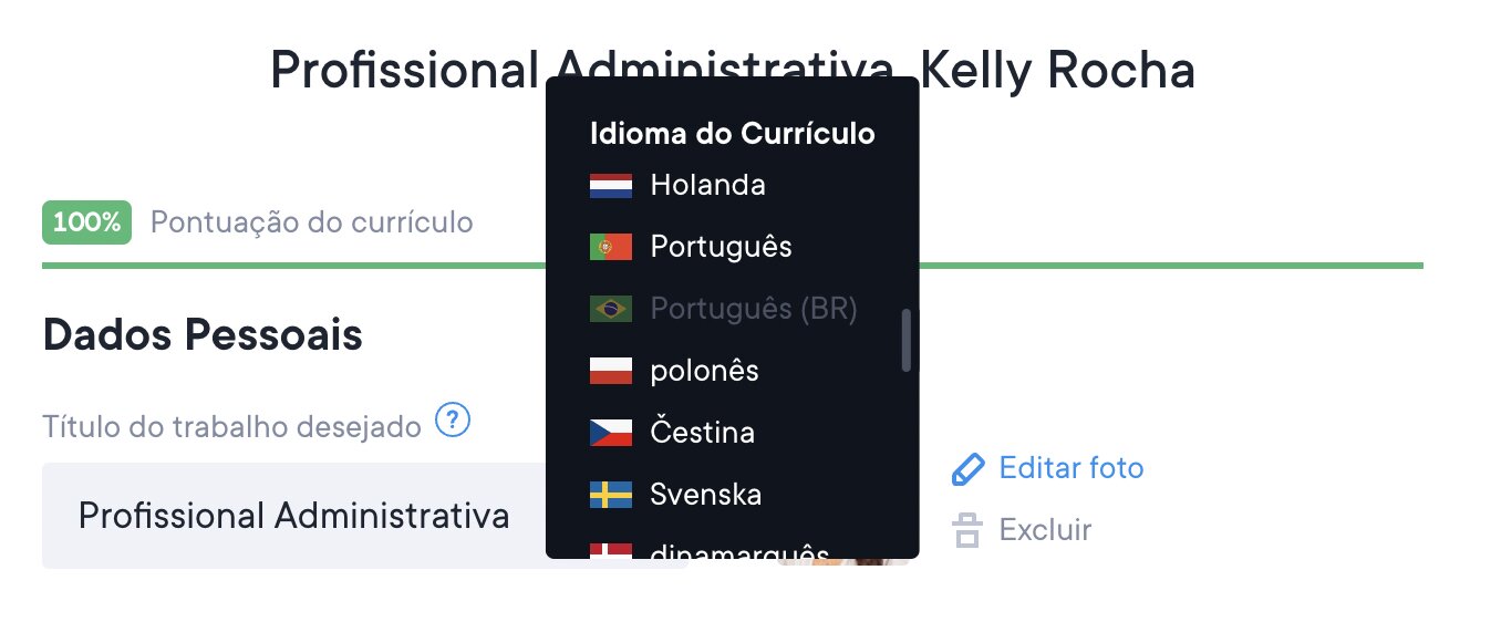 Clique para alterar o idioma do seu currículo clicando na bandeira na parte superior do editor e selecionando seu idioma. Veja a imagem abaixo.
