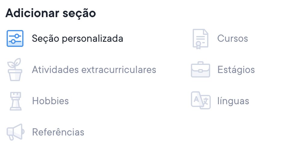Outra maneira de personalizar seu currículo é com seções personalizadas. É possível escolher qualquer título que desejar para uma seção personalizada. Para adicionar uma seção personalizada, vá até a parte inferior do editor de currículos para ver as diferentes opções para adicionar novas seções.