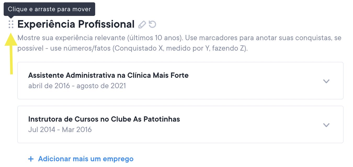 ● Reordenar seções* — todas as seções abaixo do resumo profissional/perfil, na coluna principal do currículo, podem ser reordenadas. Para reordenar uma seção, clique no ícone de grade à esquerda da seção, conforme mostrado abaixo. Você pode então arrastar seções para cima ou para baixo. Veja as capturas de tela abaixo.