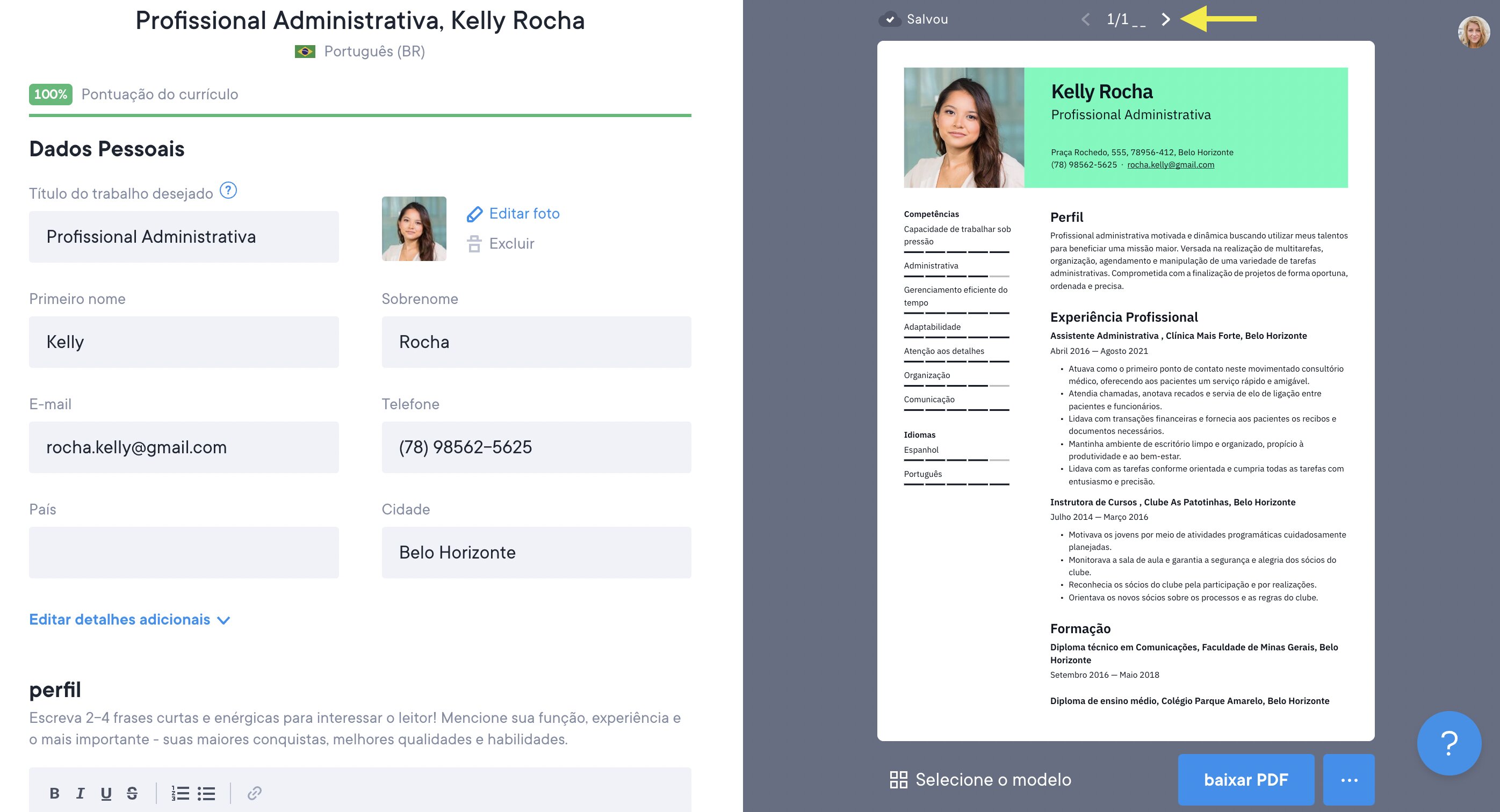 Ao visualizar seu currículo ou carta de apresentação, você verá as setas na parte superior para visualizar a próxima página. Veja a imagem abaixo.