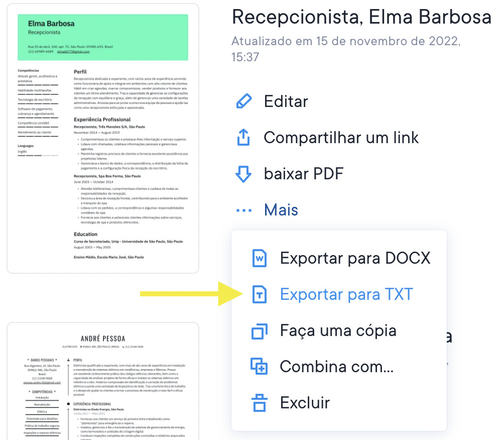 Baixar um arquivo TXT do seu currículo para copiar/colar em um editor de texto e criar um design por conta própria.
